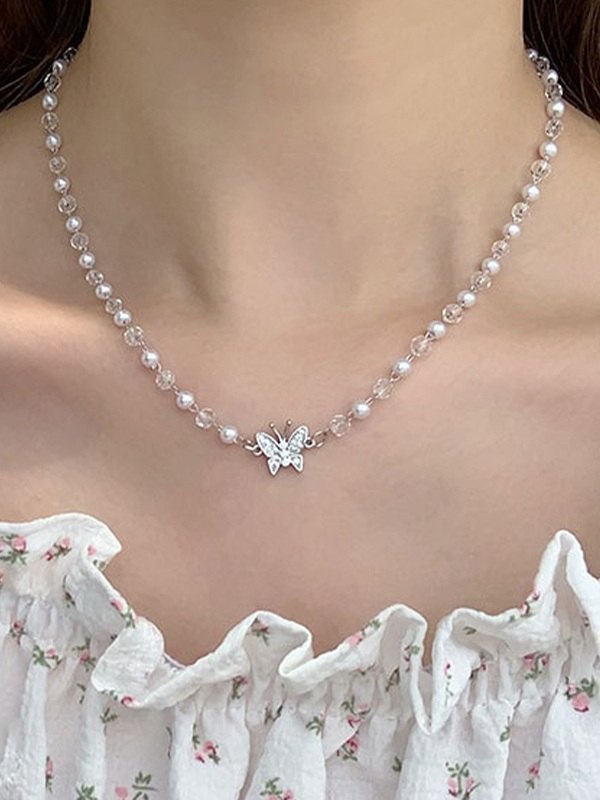 Rhinestone Butterfly Faux Pearl Necklace