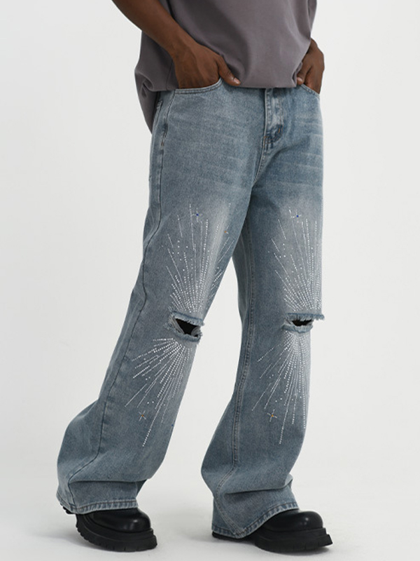 Men’s Firework Rhinestone Print Ripped Straight Leg Jeans