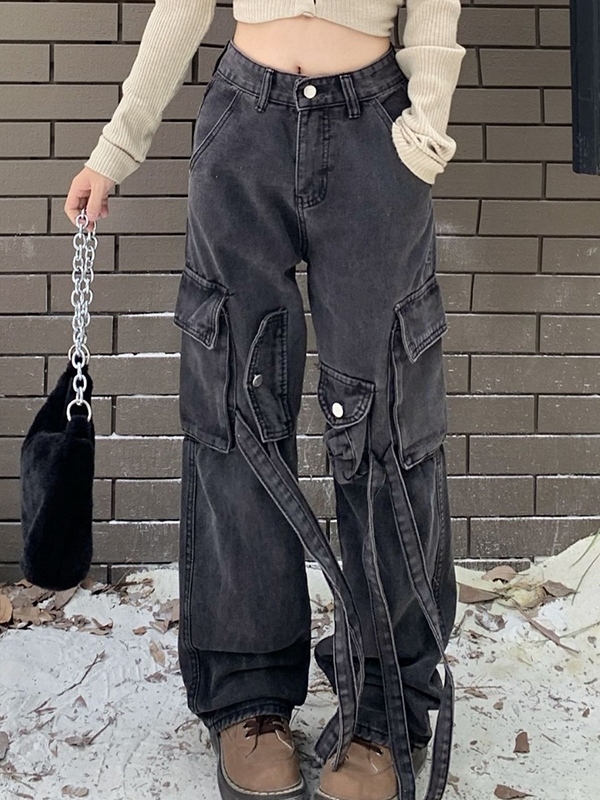 High Waist Multi Pocket Mopping Cargo Jeans