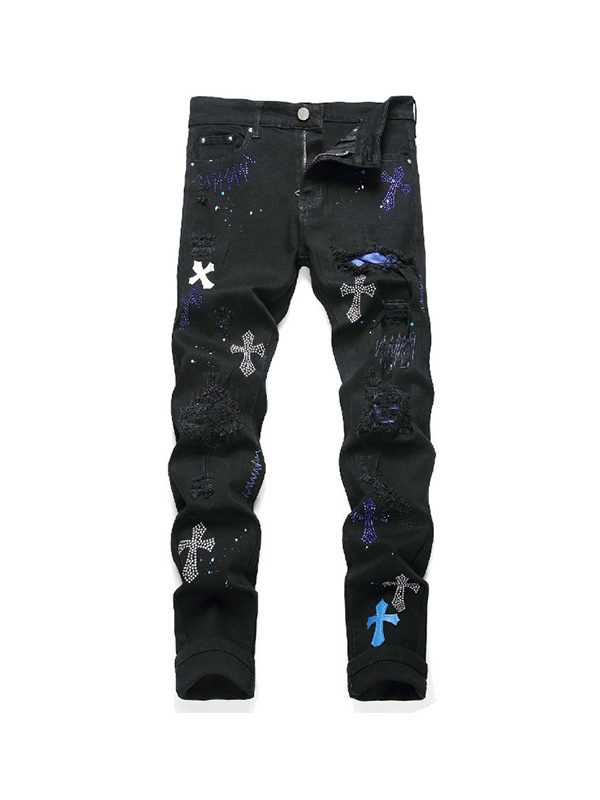 Men’s Cross Badge Rhinestone Raglan Loose Jeans