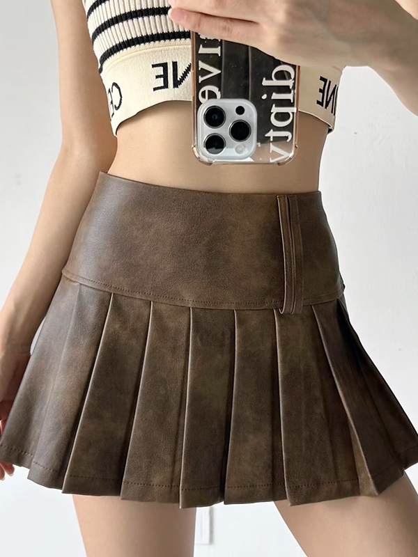Distressed Leather Pleated High Rise Mini Skirt
