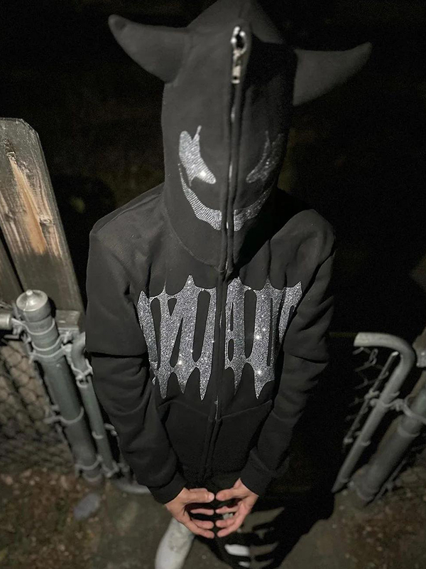 Men’s Demon Print Drawstring Zip Up Oversized Hoodie