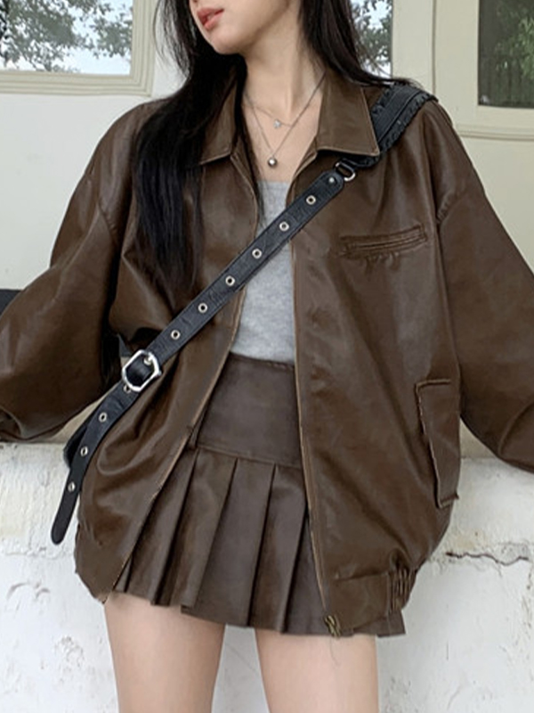 Vintage Brown Lapel Neck Zip Up Leather Jacket