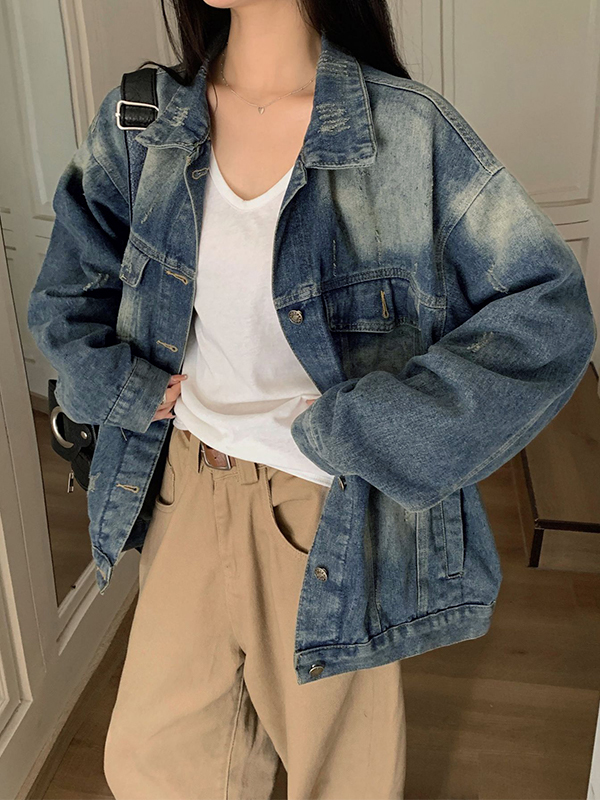 Versatile Distressed Lapel Neck Denim Jacket