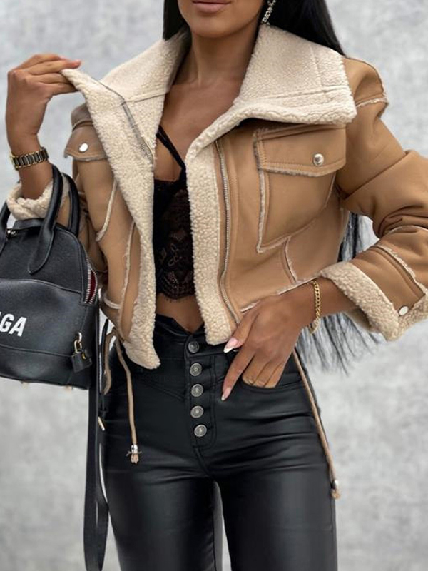 Lapel Lace Up Leather Long Sleeve Jacket