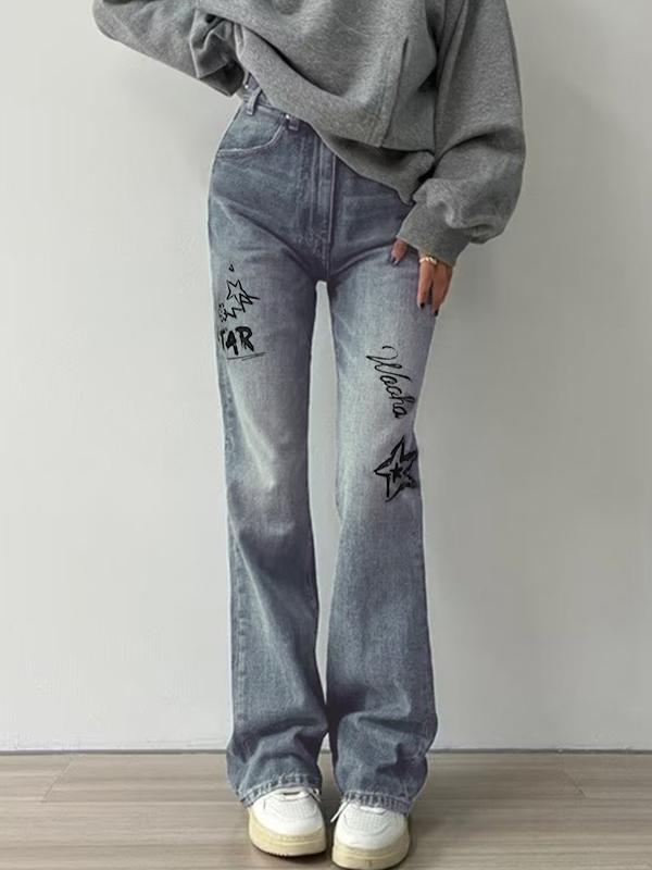 Star Letter Graffiti Print Flare Jeans