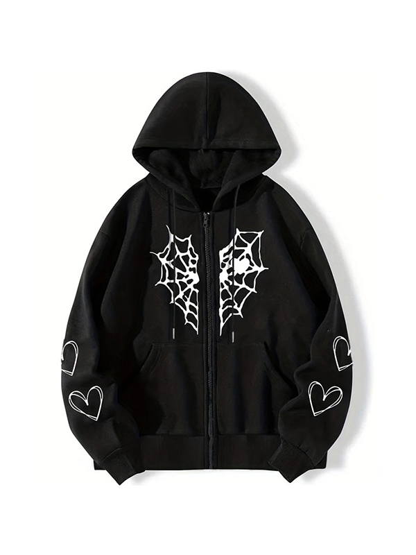 Men’s Heart Spider Web Print Zip Up Oversized Hoodie