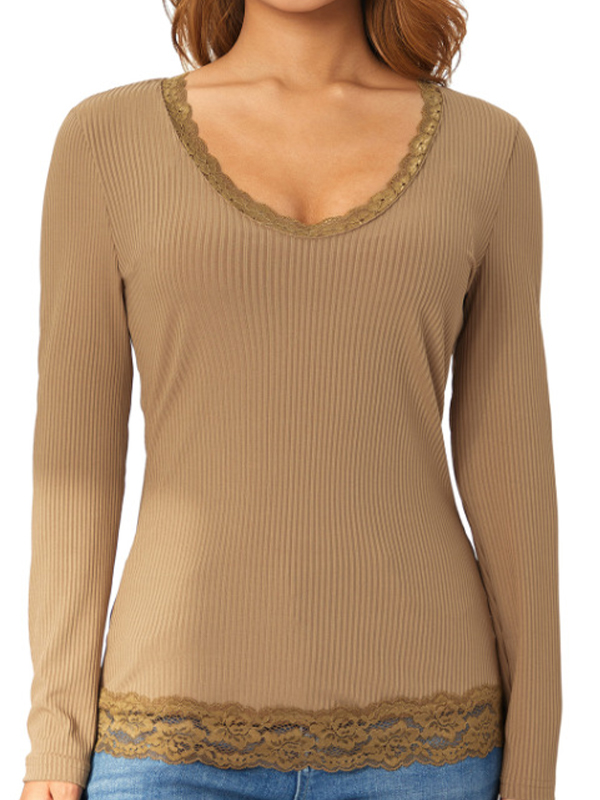 Solid Color Rib Lace Trim Slim Long Sleeve Knit