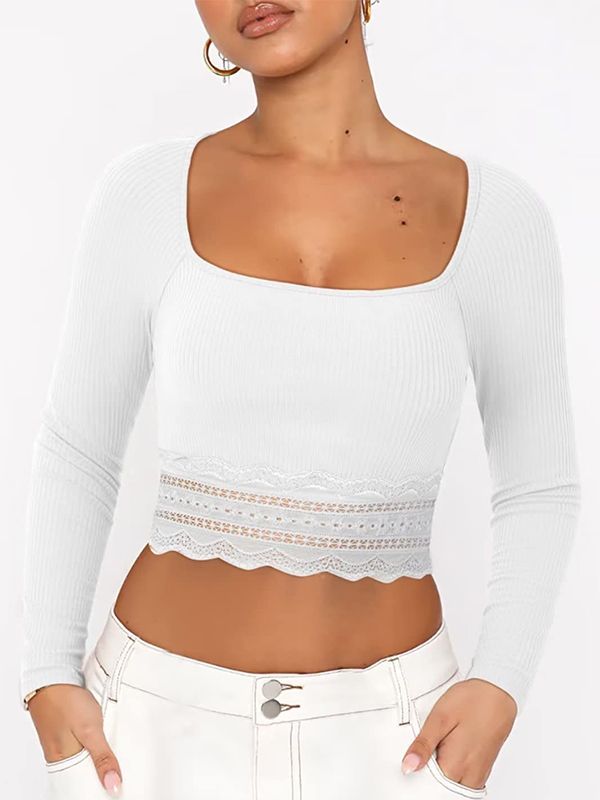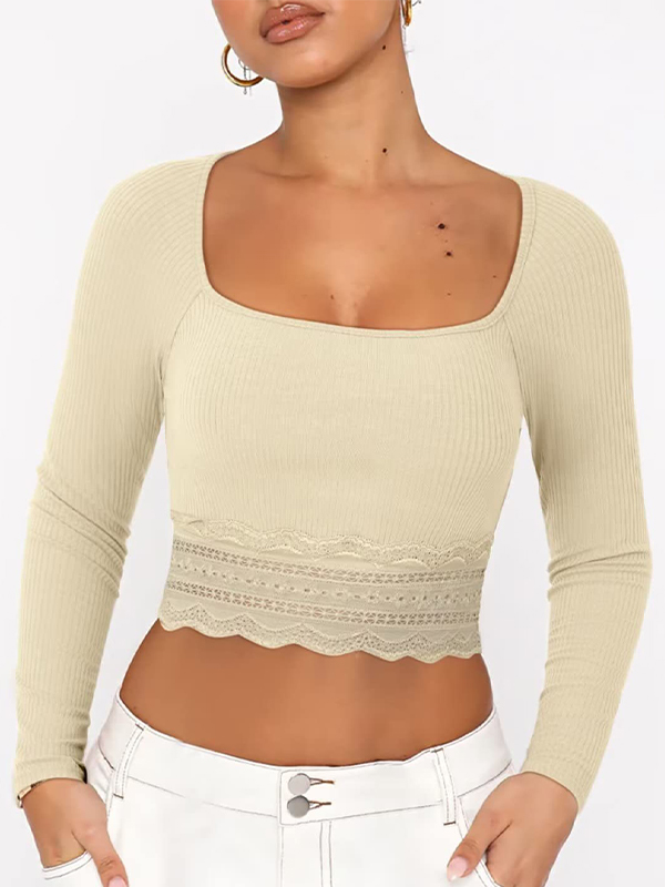Solid Color Lace Hem Square Neck Crop Long Sleeve Knit