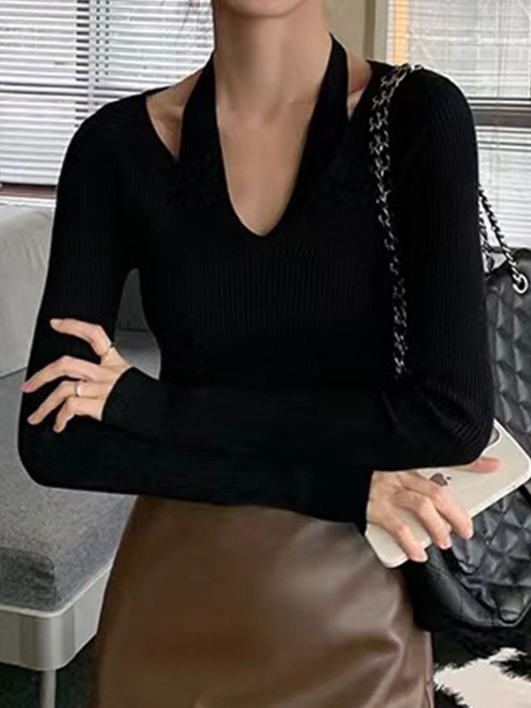 Solid V Neck Halter Long Sleeve Knit