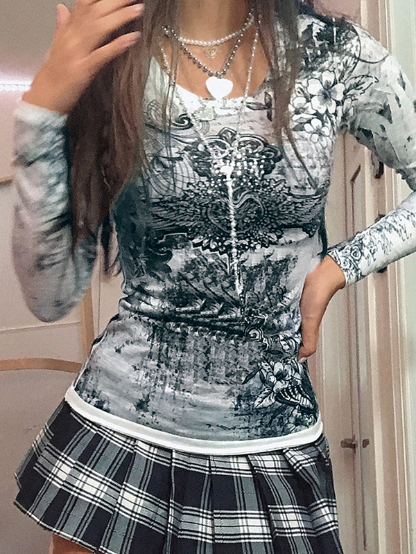 Vintage Cross Flower Print Slim Long Sleeve Tee