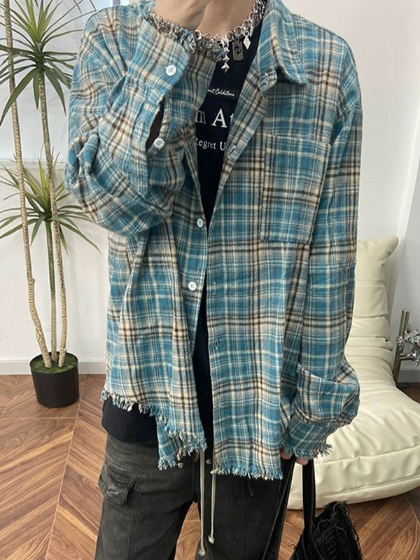 Men’s Vintage Plaid Tassel Design Long Sleeve Blouse