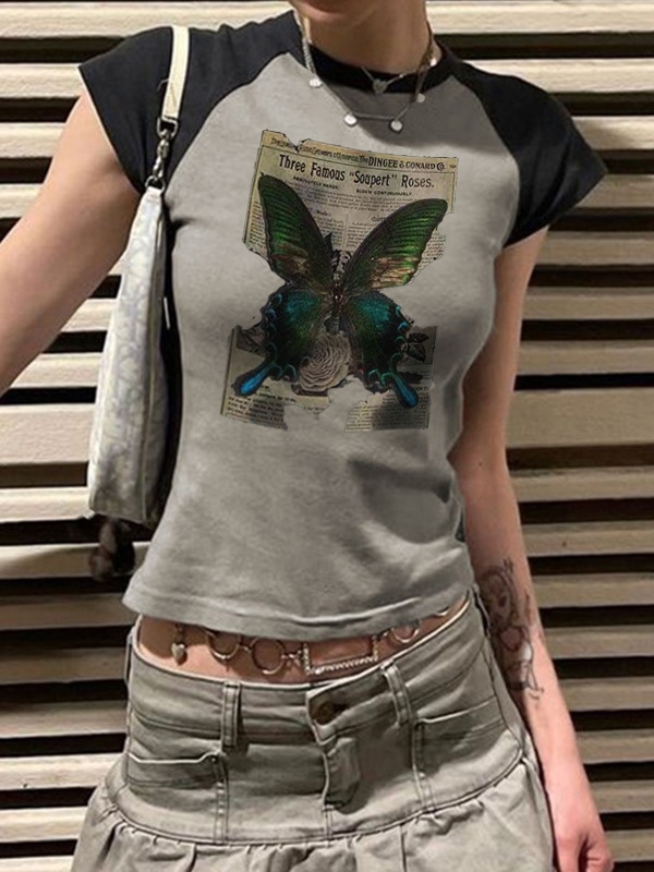Vintage Butterfly Print Raglan Short Sleeve Tee