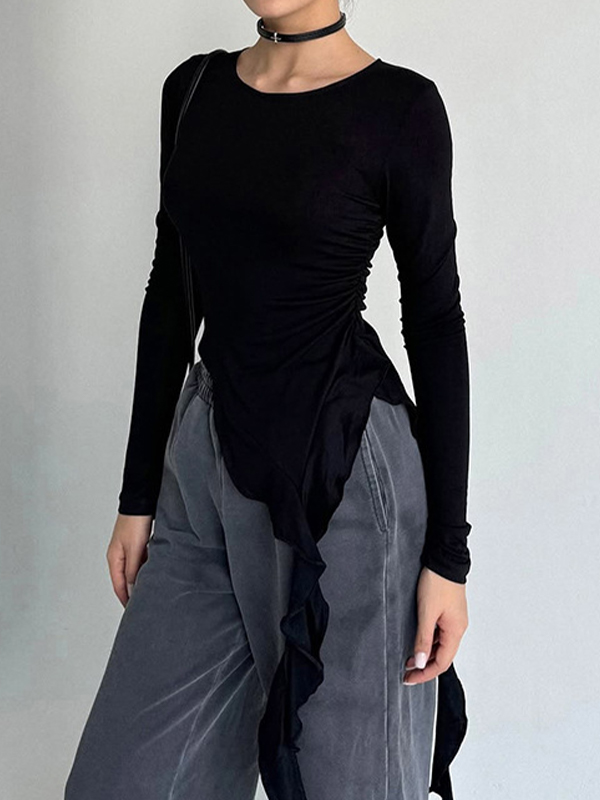 Solid Color Ruffled Long Sleeve Tee