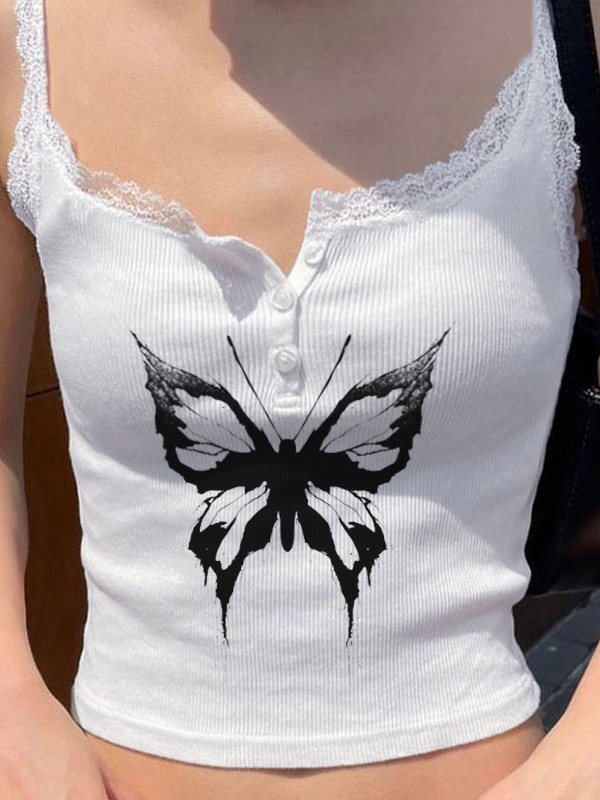 Lace Stitching Butterfly Print Slim Fit Casual Cami Top