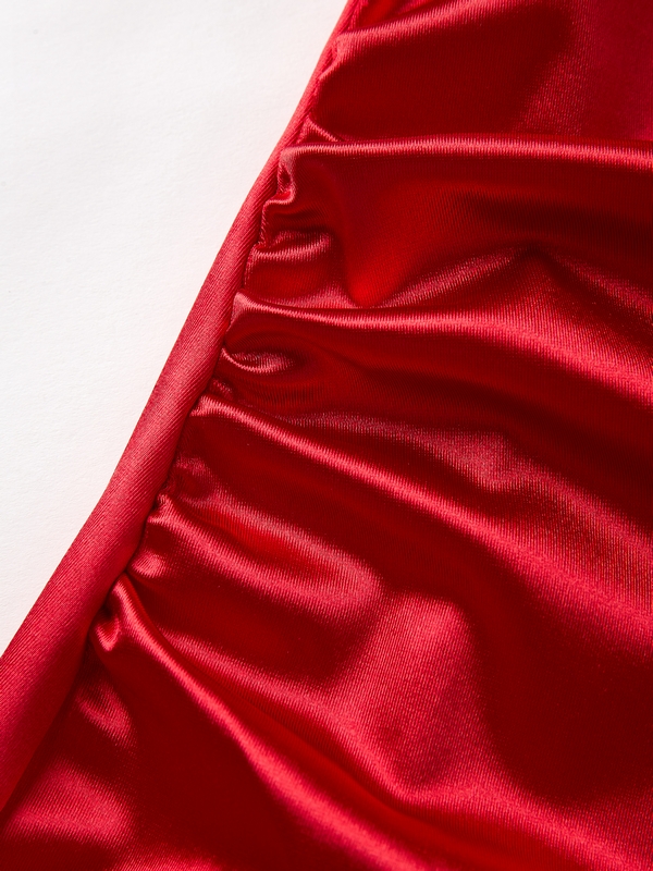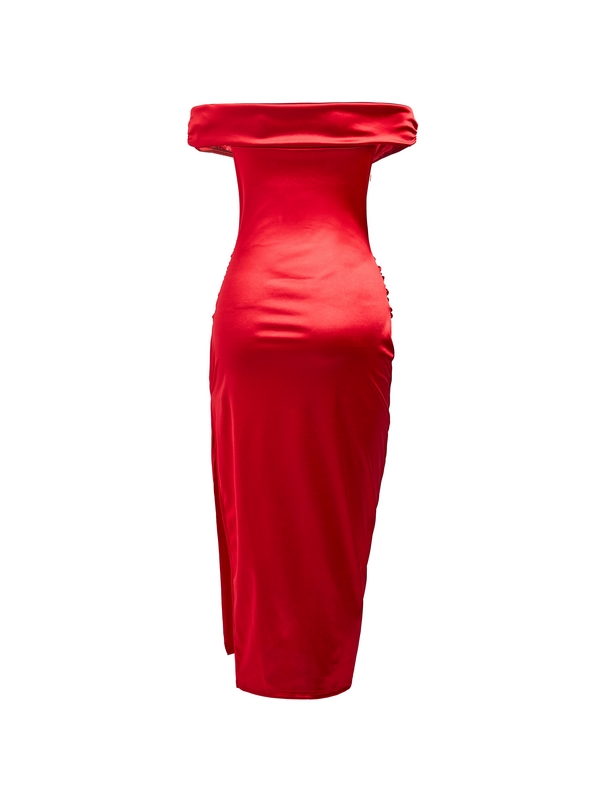 Be the first to review “Glossy Solid Off Shoulder Thigh Split Maxi Dress”