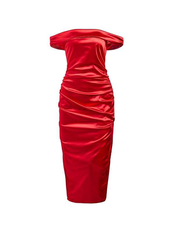 Glossy Solid Off Shoulder Thigh Split Maxi Dress